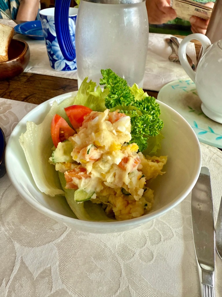 メロン、ポテトサラダ、ピクルス… どれも野菜の美味しさが際立っていて、水も水道水なのに、とにかく全部が美味しい。